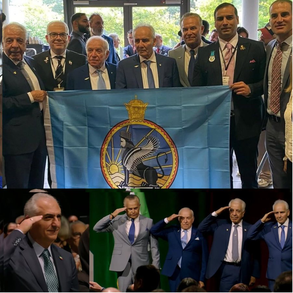 تصویر ۱: جمعی از افسران سابق ارتش شاهنشاهی با پرچم ساواک در کنفرانس همکاری ملی مونیخ ۲۰۲۵
