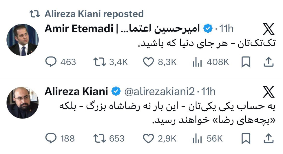 تصویر ۲: توییت تهدید آمیز مشاوران رضا پهلوی